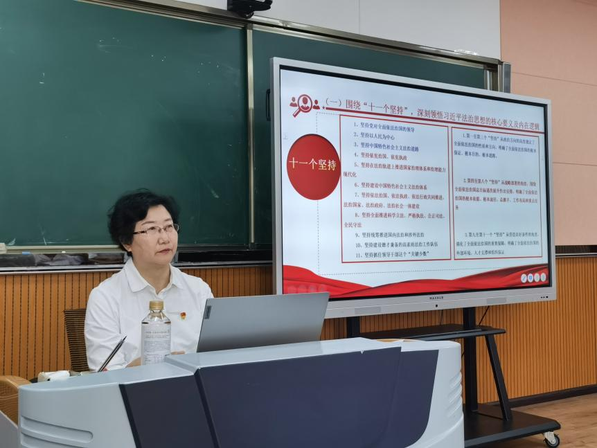 黄亚励围绕全面把握习近平法治思想的时代背景、深刻领悟习近平法治思想的精髓要义等方面进行授课,强调全院师生要始终坚持以习近平法治思想为引领,努力提升法治素养,坚定不移走中国特色社会主义法治道路。