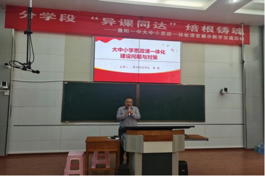 讲座环节,贵州师范学院薛璞教授作了“学校推进大中小思政课一体化的实践思考”的讲座,再次明确要把统筹推进大中小学思政课一体化建设作为一项重要工程,坚持问题导向和目标导向相结合,坚持守正和创新相统一,推动思政课建设内涵式发展。分清不同学段培育目标:小学阶段重在培育学生的道德情感,初中阶段重在打牢学生的思想基础,高中阶段重在提升学生的政治素养、大学阶段重在增强学生的使命担当。鼓励各位老师在思政课一体化构建中,要将独立的若干教学要素融合在一起成为一个有机整体、要通过内部要素合并,融合为一个有机整体,形成协调效应,同向同行,发挥最优效果。