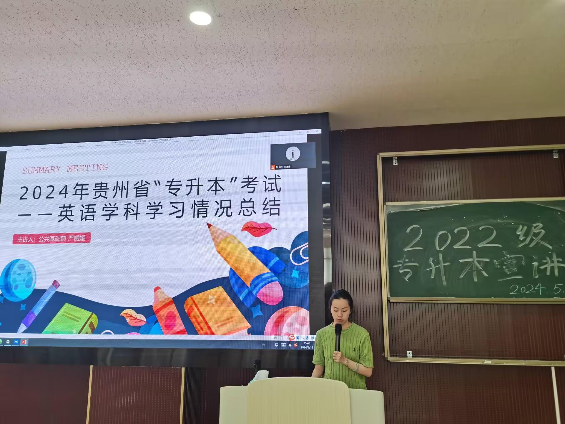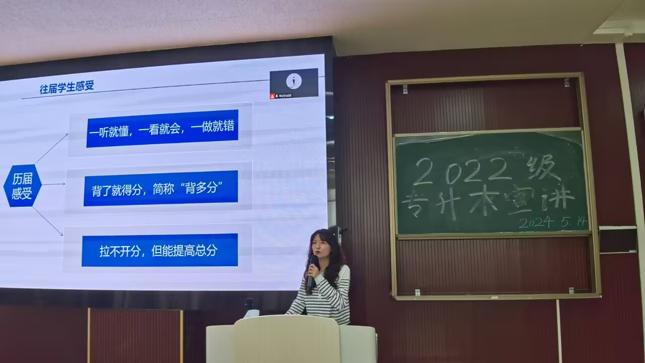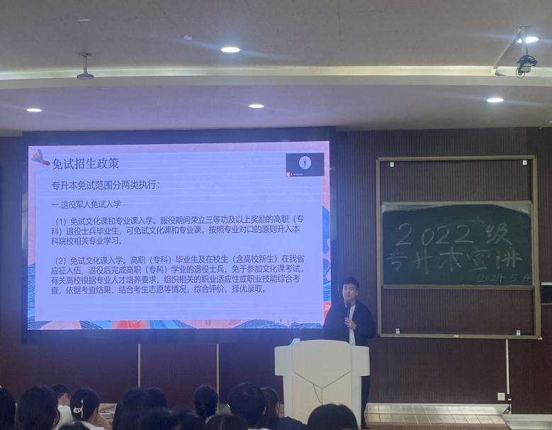 2024年5月14日,公共基础部在金海校区阶梯六教室举办了2022级“专升本”考试宣讲动员大会。会议由公共基础部汪迎接主持。学生工作处、2022级全体辅导员、2022级各班学生代表240余人参加了此次宣讲动员大会。