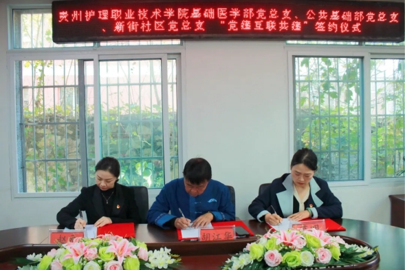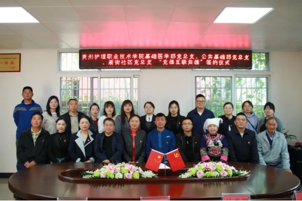 为深化党建工作内涵,创新党建形式、激发党建活力,强化校地联动,实现资源共享、优势互补。在我院党委和盘江镇党委大力支持和精心指导下,10月23日上午,我院基础医学部党总支、公共基础部党总支与盘江镇新街社区党总支举行互联共建签约仪式。