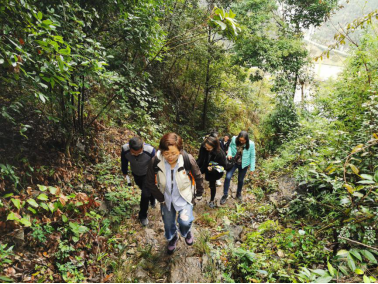 上午十一时,在讲解员的带领下,我院全体人员首先冒雨进行重走“艰辛路”的实地体验。这条出山小路是当年麻怀村人出山必经和唯一的一条路,山路蜿蜒崎岖、湿滑陡峭、狭窄危险,稍不注意就会摔倒或跌下山坡。山路不算太远,却举步维艰,更别说孩子们上学或村民们担着重物每日在此往返,这让在场的人深刻感受到麻怀人长期以来生活条件的艰辛和困苦。