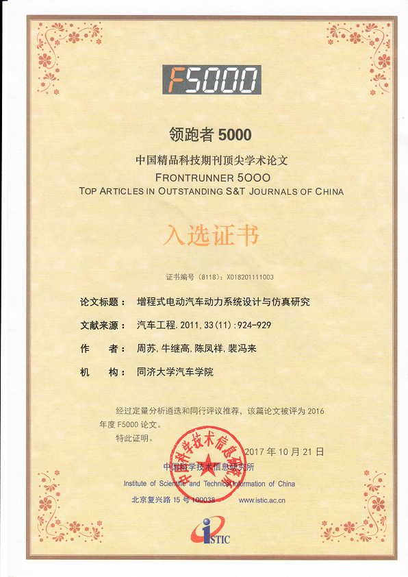 继同济大学汽车学院2010年发表的一篇论文:“谢星,周苏,王廷宏,陈凤祥,基于Cruise/Simulink的车用燃料电池/蓄电池混合动力的能量管理策略仿真,汽车工程, 2010, Vol.32(5):373-378.”入选2012年度F5000论文后,我院又有一篇论文“周苏,牛继高,陈凤祥,裴冯来,增程式电动汽车动力系统设计与仿真研究,汽车工程,2011,33(11):924-929”经定量分析遴选和同行评议推荐,被评为2016年度F5000论文。