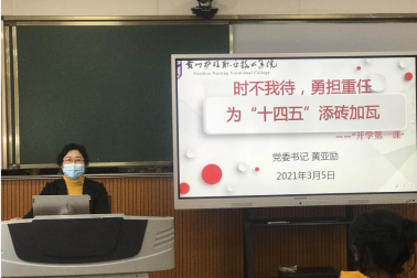 党委书记黄亚励为金海校区的同学们讲授题为《时不我待,勇担重任,为“十四五”添砖加瓦》的开学第一课。她结合2020年我国在抗击新冠肺炎疫情和脱贫攻坚工作上取得的成绩,从国家、贵州、学院三个层面与大家分享了对“十四五”规划开局之年的认识和解读。她强调,全院教职工生要更加紧密地团结在以习近平同志为核心的党中央周围,高举中国特色社会主义伟大旗帜,努力学习,勇于实践,更要坚持以习近平新时代中国特色社会主义思想为指导,坚持社会主义办学方向,全面落实立德树人根本任务,办好人民满意的高职教育。她向同学们提出三点建议,希望大家进一步明确努力方向,坚定理想信念,厚植家国情怀,树立远大理想:一是要坚定马克思主义、共产主义信仰,坚定中国特色社会主义信念。加强党史、新中国史、改革开放史、社会主义发展史的学习。二是要坚持爱党爱国爱民爱社会主义制度。用实际行动积极投身健康中国、健康贵州建设,为保障人民健康、为中华民族伟大复兴贡献自己的力量。三是要学会做人、学会学习。万品德为首,同学们要一如既往秉持“医者仁心,尚德尚行”的校训,把学院精神和个人追求融入党和国家事业发展之中,讲担当、讲团结、讲科学、讲奉献,为实现梦想迈出坚实的步伐。
