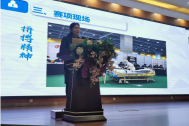 我院护理系杨晓玲老师作为此次大赛健康照护赛项裁判兼选手指导老师进行经验分享。杨晓玲老师从大赛简介、备赛过程、比赛现场、成绩情况、体会与反思五个方面做了分享报告。这次是我院师生首次参与大赛,通过这次赛项的准备和参与,虽然没有获得预期的奖项,但是在大家的共同努力下,达到了以赛促学、以赛促学、以赛促训和重在参与、重在学习、重在交流、重在提高的目的。杨老师还积极鼓励同学们仰望星空,也要脚踏实地,在校学习期间练就娴熟技能,将来才能更好地从事护理职业。杨老师表示,相信在学院党委行政的坚强领导下,在全校师生的共同努力下,打基础、抓规范、建团队、走出去、创特色,一步一个脚印,脚踏实地,一定可以冲出省赛、在第二届全国技能大赛上取得优异的成绩!