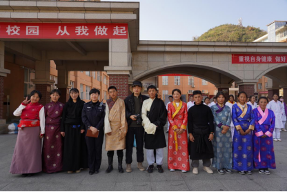 西藏班同学朗斯、噶玛尊珠穿着民族盛装,代表全班同学发言,对各级领导对西藏同学的关心和爱护表达感谢,并承诺一定会努力学习,不负众望。