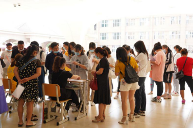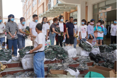 新生在家长陪同下排队领取军训服