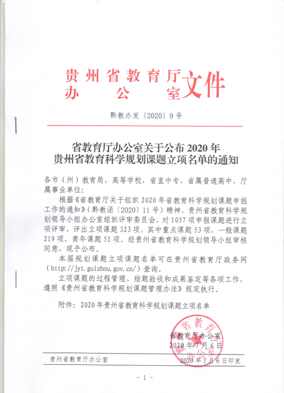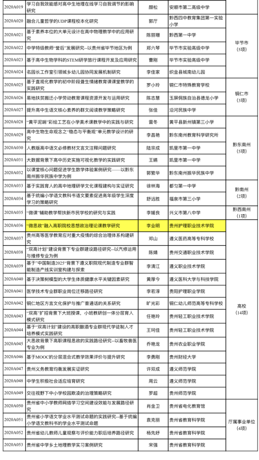 贵州省教育厅办公室日前公布了“2020年贵州省教育科学规划课题”立项名单。我院公共基础部李业明老师和基础医学部齐财华老师分别获得了教育科学规划重点课题和青年课题立项。