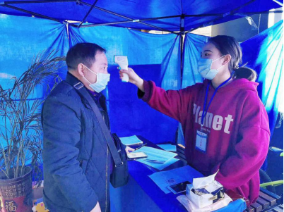田洁丹同学正在为群众测量体温
