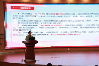 大会在庄严的国歌声中拉开序幕。贵定县武装部副部长何小平结合近年来国际、国内形势,国家发展战略与我军强军兴军的目标进行了深入分析,强调了大学生征兵入伍的重要性。随后人武部征兵办干事李静为同学们详细解读了大学生应征入伍享有的优惠政策、征兵网上报名及体检流程,鼓励大家积极参军入伍,报效祖国。