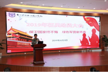 为深入学习贯彻党的十九大精神和习近平强军思想,做好大学生征兵工作,6月3日,我院举办了以“保卫国家终不悔,绿色军营献青春”为主题的征兵工作动员大会。贵定县武装部副部长何小平、学院党委书记黄亚励、贵州省人民医院护士学校副校长张正红、党委办公室临时负责人罗湘莉、总务处临时负责人詹沛晶、高职辅导员及学生代表共300余人参与了此次动员会。