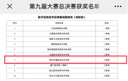 最终,我院取得“医学信息技术应用赛项团体奖(高职组)”三等奖,三名学生分别获得个人二等奖,毛锐老师、王小娟老师、刘颜老师获得优秀指导老师。