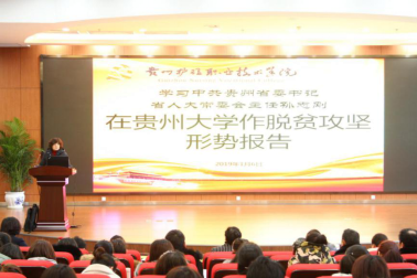 会上,全体教职工首先观看学习了《中共贵州省委书记省人大常委会主任孙志刚在贵州大学作脱贫攻坚形势政策报告》视频,孙志刚书记用生动鲜活的数据和事例,重点围绕打好以农村“组组通”硬化路为重点的基础设施建设、易地搬迁扶贫、产业扶贫和教育医疗住房“三保障”“四场硬仗”作了深入浅出的讲述,详细介绍了“五步工作法”“六个坚持”“五个工作体系”以及农村产业革命“八要素”等经验做法,并鼓励全省广大师生积极投身火热的脱贫攻坚战场,大力弘扬新时代贵州精神,向英雄模范人物学习,深入研究问题、着力破解难题,在实践中学会做群众工作,在脱贫攻坚中增长才干、建功立业,奋力实现新时代新作为。