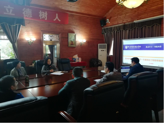 项目验收会由罗湘莉主任主持,会议分为听取汇报、现场勘察和验收意见会三个环节。首先,志胜公司经理许伟就我校校园“一卡通”项目建设的具体内容及完成情况进行了详细汇报。我校“一卡通”项目,2017年12 月完成项目建设招标,2018年2月底完成建设施工,经历了4个月的试运营,于8月底正式运行,实现了自助迎新、门禁系统、教务考勤系统、消费系统、水控管理、学生自助打印、自助圈存、卡务中心结算、秘钥管理等多种综合功能。目前持卡用户一万余人,运行基本稳定,效果良好。