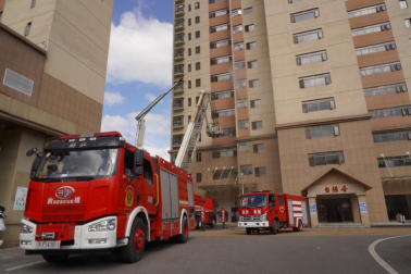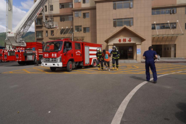 演练正式开始,自强居警报随即响起,烟雾瞬间“占领”了2-5层过道。短短的3分钟内,在应急救援组的及时疏散救援下,“被困”的120名学生用湿毛巾捂住口鼻有序撤离了“火灾”现场,并整齐地到达指定疏散场所。随后,经清点人数发现有2名学生仍被困无法实施救援,徐晓筑立即下达命令,向119请求支援。消防车火速赶到现场,两名消防队员立即全副武装冲进了火场,同时使用云梯对被困5层的学生进行破窗救援工作。在消防队员的努力下,两名学生被成功救出火场,经过5分钟持续喷水灭火,火情也顺利消除。最后,后勤医疗保障组的医务人员对被疏散的同学进行了心理疏导,并对出现“眩晕”的同学进行了紧急救治。