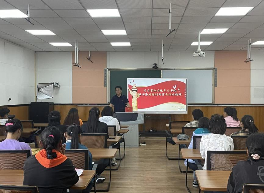8月31日下午,我院党委副书记吴忠红在博文楼录播室为中职西藏班学生宣讲《学习贯彻习近平总书记在西藏考察时的重要指示精神》。他从“打牢民族团结的思想基础”“走出一条符合西藏实际的高质量发展之路”“坚持以人民为中心的发展思想”“坚定不移走生态优先、绿色发展之路”“在锤炼党性、为民服务、推动发展上力行”五个方面进行阐述。从结合当今国际发生的实事到如今在祖国怀抱的西藏呈现国泰民安、民族团结进步繁荣发展、人民安居乐业、人民生活幸福,一片欣欣向荣、祥和的景象,让大家知道幸福生活来之不易,应倍加珍惜当下,感恩于党,听党话跟党走。他教育引导西藏班学生要树立马克思主义国家观、历史观、民族观、文化观、宗教观,身体力行做好交往交流交融,为增进民族团结作贡献。