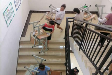 宿管、保洁正在搬运课桌椅