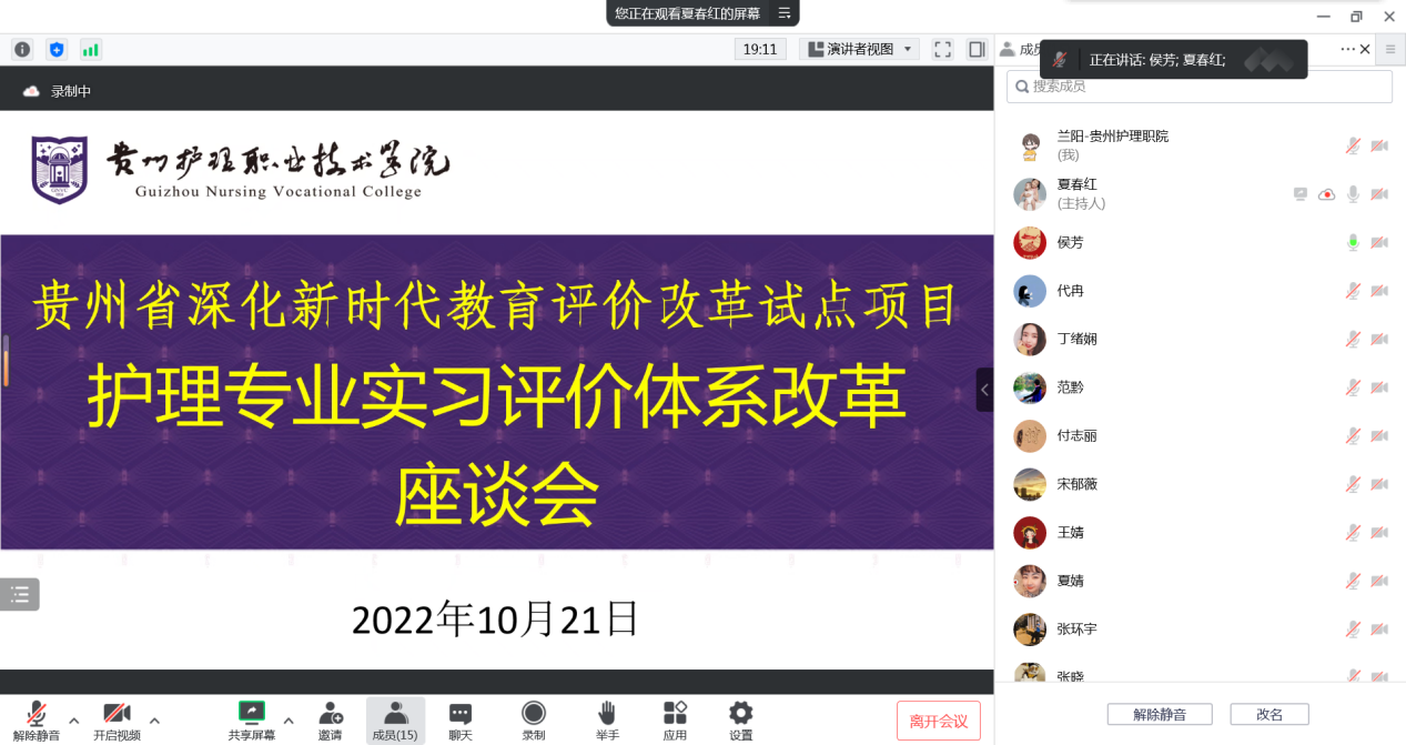 10月21日,我院教育评价改革项目组线上召开了护理专业实习评价体系改革座谈会。我院教学质量监控与评估办公室主任侯芳,教务处负责人夏婧,教学专家张正红、范黔及相关职能部门负责人和项目组全体成员参加会议。会议由教务处实习管理科负责人夏春红主持。
