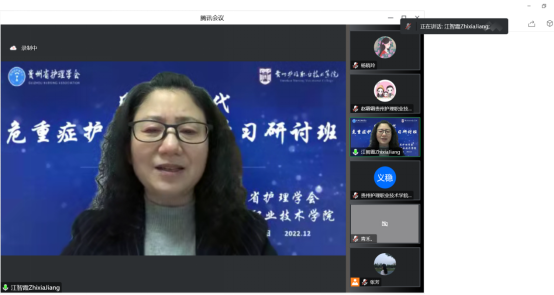本次研讨班共有300余名学员参会,2022年12月29日上午9点在云端举行了开幕式,伟德国际1946院长、贵州省护理学会理事长江智霞致欢迎辞。江智霞指出现阶段疫情防控政策做了重大调整,将工作重心从防控感染转向防重症、防死亡、保健康,特别需要关注老年人、有基础性疾病人群等重症高风险人群。危重症护理事业是一项崇高而神圣的事业,更是一项需要我们大家一起凝智聚力、共谋共促的事业。希望各位护理同仁珍惜好机会,认真倾听、主动请教、积极探讨,进一步拓宽学术视野,增长见闻、提升技能,增强危重症护理服务质量。