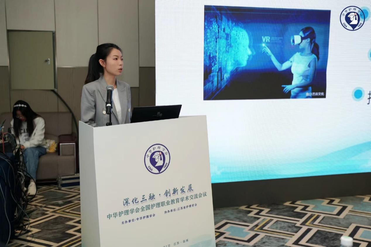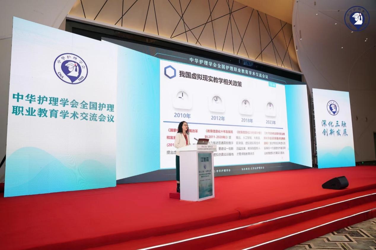 10月21日,江智霞以《虚拟现实驱动护理教学模式创新》为题作了主旨发言,从虚拟现实概念与应用场景、虚拟现实在护理教育中的应用、虚拟现实机遇与挑战三方面进行阐述,指出虚拟现实技术在护理教育领域可作为一种新颖的教学手段,有助于改善教学效果,丰富教学模式,具有较强的实用性,在未来教学中,虚拟教学与传统实验教学必将并驾齐驱,进一步融合,共同创设智慧教学数字化新情境。