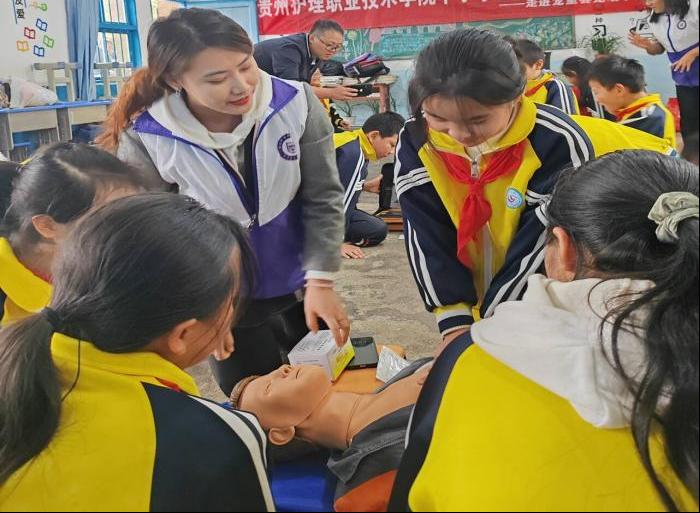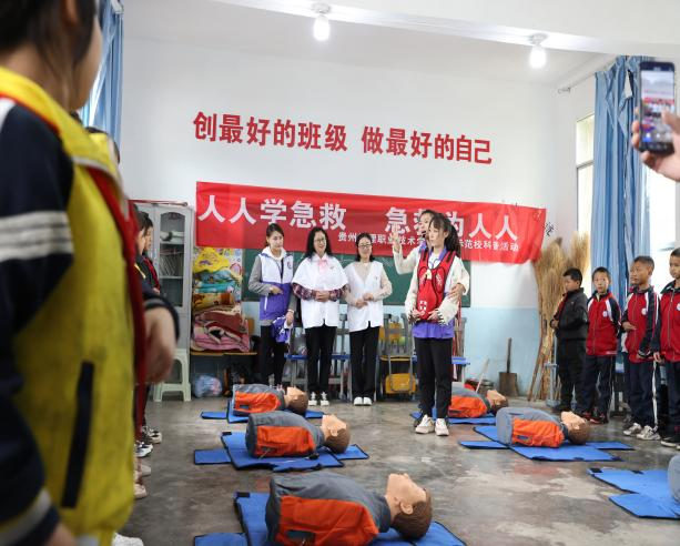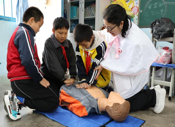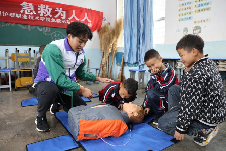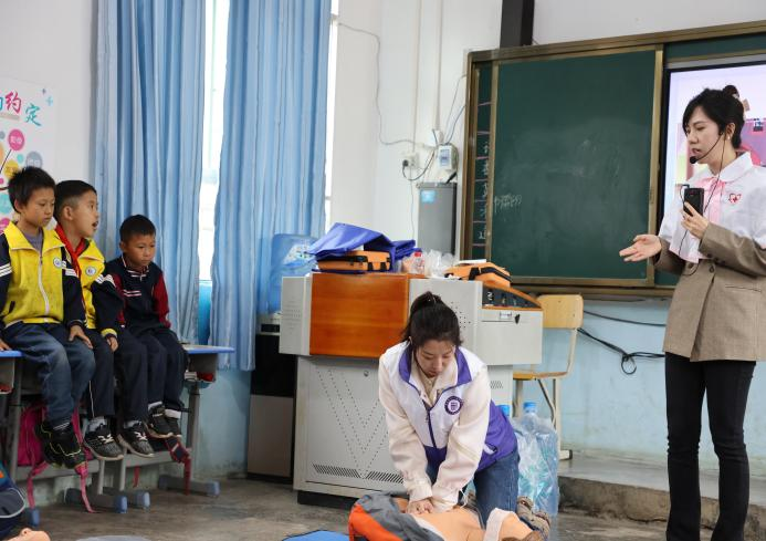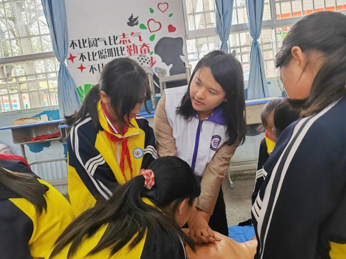 在龙场小学,为进一步加强乡村健康科普教育和健康促进工作,有效将急救知识、安全知识和健康知识推广覆盖到更多群体,营造“人人学急救,急救为人人”的良好社会氛围,助力乡村振兴,学院教师及学生代表走进教室。他们运用通俗易懂的语言,结合常见的案例,为龙场小学学生详细讲解了“海姆立克急救法”和“心肺复苏术”产生背景、使用场景、操作方法及注意事项等,并邀请小学生们进行现场模拟操作,手把手进行指导,激发了小学生们浓厚的学习兴趣。