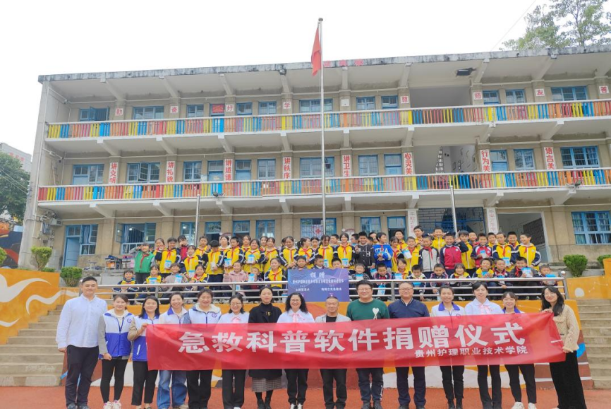 科普教育活动后举行了捐赠仪式。江智霞代表学院将学院自主研发的“心肺复苏术”“海姆立克急救法”两套软件及60套文具捐赠给龙场小学。