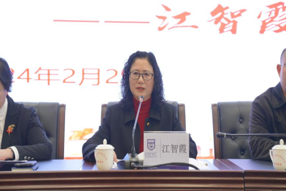 江智霞作题为《笃行深耕 聚力谋远 乘势而上谱新篇》的讲话。她首先总结了2023年学院在党的全面领导、干部队伍建设、人才培养质量、践行五育并举、深化教学改革、扩大开放办学等十一个方面取得的工作成效,在肯定了上一年工作成果的同时也指出了存在的不足。最后她提出了关于2024年工作打算:一是坚持党建引领,筑牢发展根基;二是坚持以生为本,提升育人质量;三是坚持以赛促建,打造技能高地;四是坚持科教协同,提升科研水平;五是坚持交流合作,提升办学水平;六是坚持德才兼备,强化干部培养;七是坚持文化先行,提升综合实力;八是坚持专业优势,助力乡村振兴;九是坚持安全发展,维护校园稳定;十是坚持服务导向,强化保障支撑。