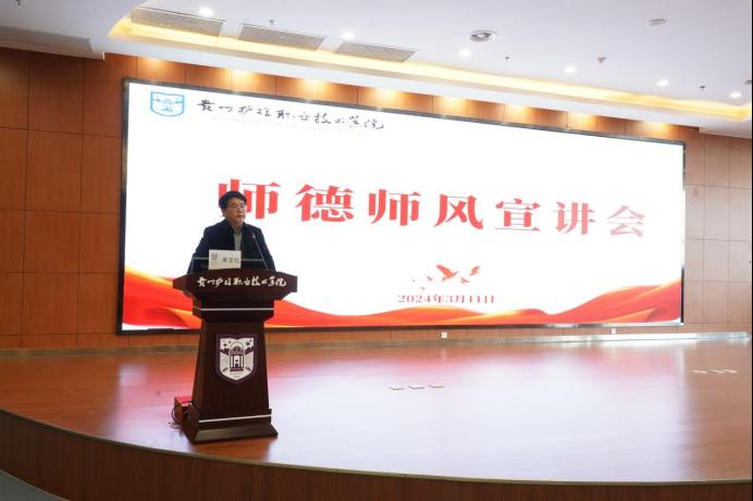 3月11日,我院举行师德师风教育宣讲会,特邀贵州师范大学党委教师工作部部长、人事处处长、贵州省师德师风宣讲团专家张葳副教授进行宣讲,学院党委委员、纪委书记杨伯兵出席,全院教职工参加。会议由学院党委副书记吴忠红主持。