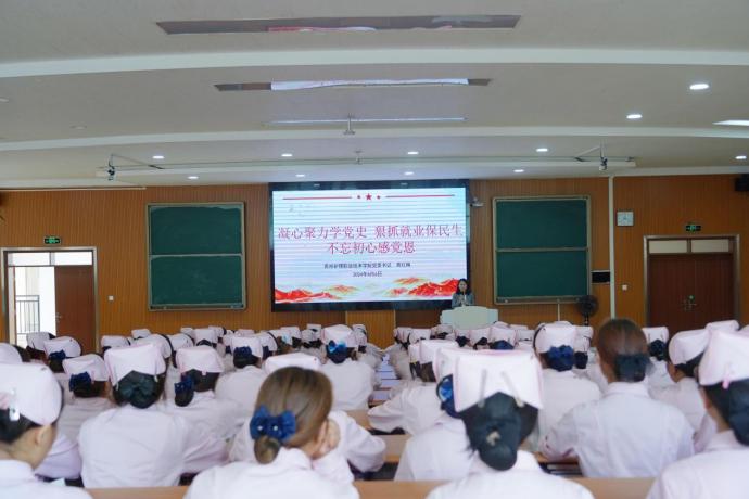 为认真学习贯彻习近平总书记关于思政课建设的重要指示批示精神,进一步加强学生思想政治教育,6月6日下午,学院党委书记蒋红梅深入联系班级,为2023级53/54班助产专业的学生讲授题为《凝心聚力学党史 狠抓就业保民生 不忘初心感党恩》思政课。