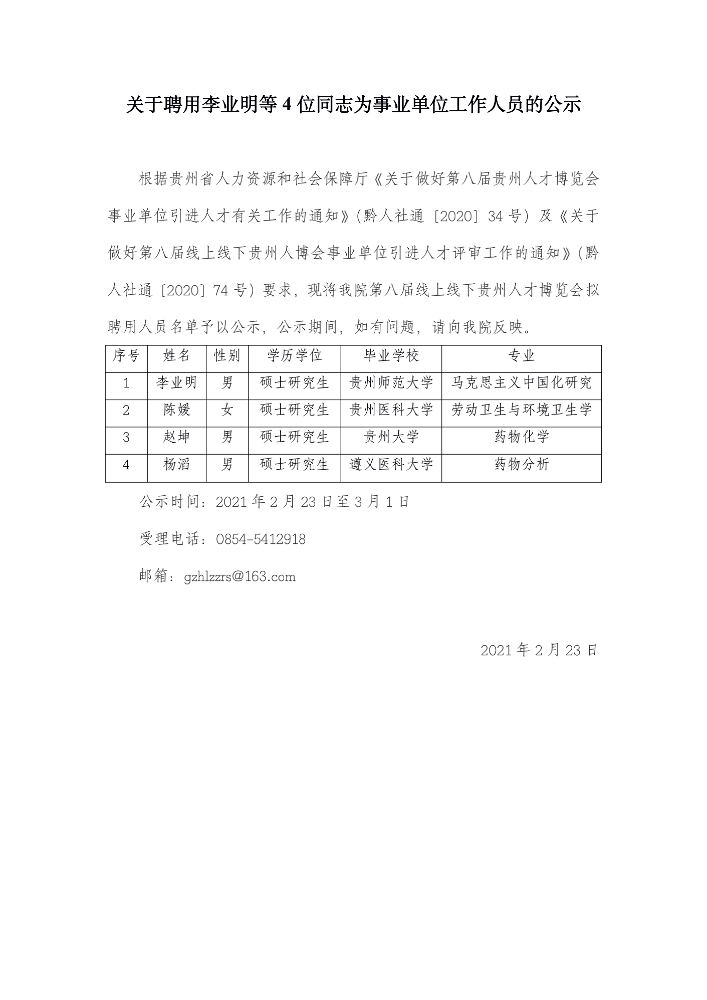 关于聘用李业明等4位同志为事业单位工作人员的公示