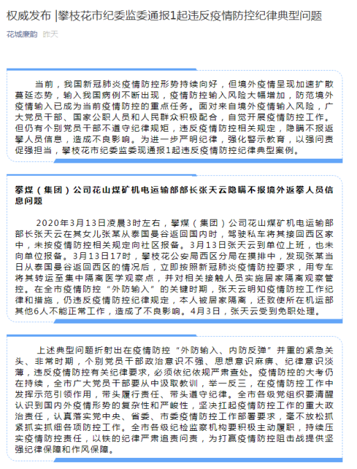3日,四川攀枝花纪委监委微信公众号发布通报称,攀煤(集团)公司花山煤矿机电运输部部长张天云在其女儿从泰国曼谷返回国内时,驾驶私车将其接回家中,未向社区报备,违反疫情防控纪律规定。4月3日,张天云受到免职处理。