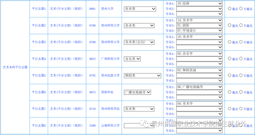 9.艺术类考生在填报艺术类平行志愿时,要根据参加的艺术类专业考试合格情况选择专业类别,同一院校的不同类别专业分别填在不同志愿,可以填报多所院校多种类别的专业。