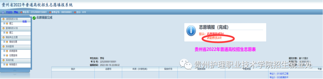 14.如考生需修改后重新提交,请点击“填报志愿”菜单,再次进入填报页面,系统将提示剩余修改后提交志愿的次数。考生最多可以修改2次志愿,系统以最后一次提交的志愿为准。