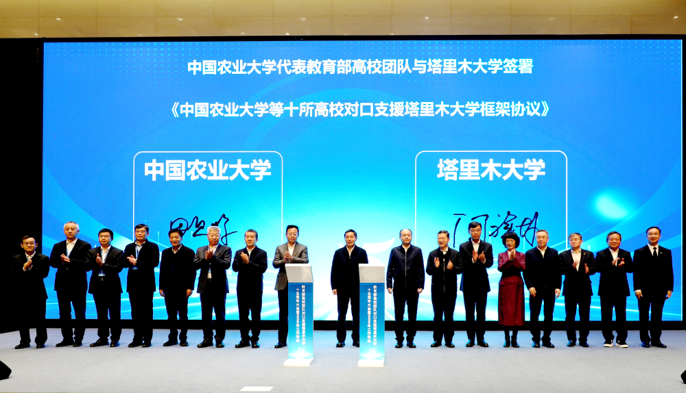 组长单位、中国农业大学代表教育部高校团队与塔里木大学签订了对口支援框架协议,塔里木大学与中国农业大学、浙江大学、华中农业大学、北京化工大学、东华大学签订了新一轮对口支援协议书。
