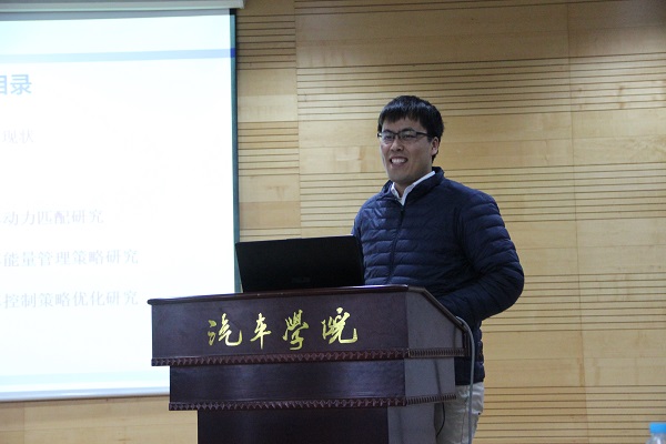 徐宁的演讲主题是《增程式电动公交客车能量管理及控制策略优化研究》,他向大家介绍了增程式电动汽车的发展现状,阐述了个人研究的总体思路,对增程式电动公交客车的动力匹配、能量管理、控制优化等研究领域进行了细致翔实的展现。林老师表示增程式的方案将是未来重要的能源替代方案之一,对徐宁博士生的研究给予了高度重视。常老师详细询问了徐宁博士生在研究过程中遇到的挑战,并对其研究成果的后续优化提出了具体建议。