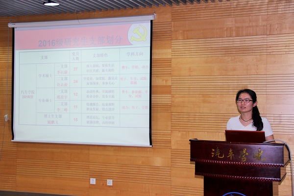 接下来,葛畅老师在会上介绍了汽车学院研究生党建工作的特色和理念、各支部的划分情况、覆盖学科方向等相关信息,让新生党员对所在支部组成有了明确认识。