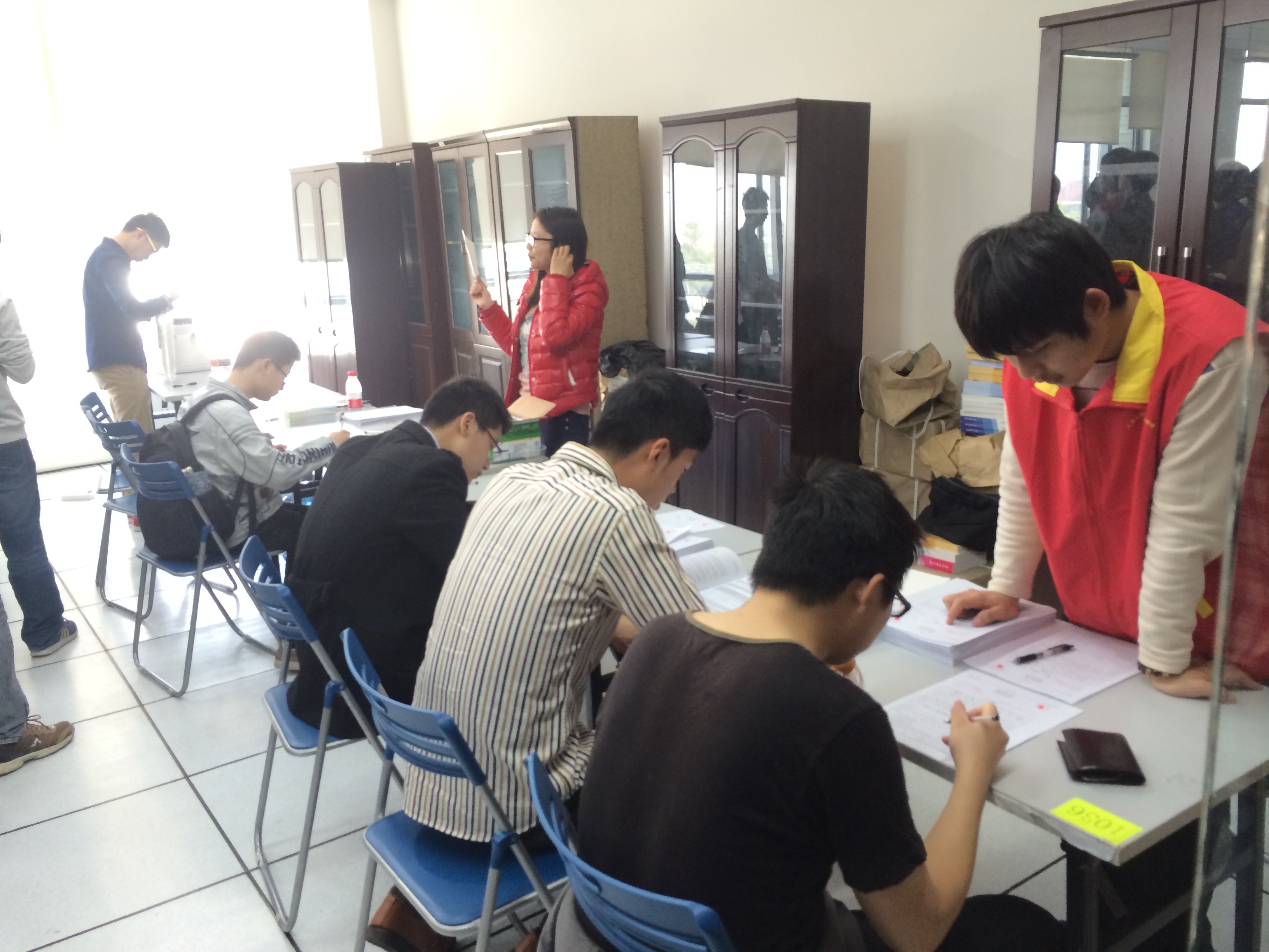 从中午12点15分开始,便陆续有同学走进F楼,在学院老师、班长的带领下,集结的同学们,一小队一小队地往楼上行进,进入临时布置的献血大厅后,依次序排队,进行献血的各个流程:填表格、量血压、测血型、抽血。同学们献血的热情高昂,随着时间的推移,不一会儿,大厅里便围满了人,但仍是井然有序。