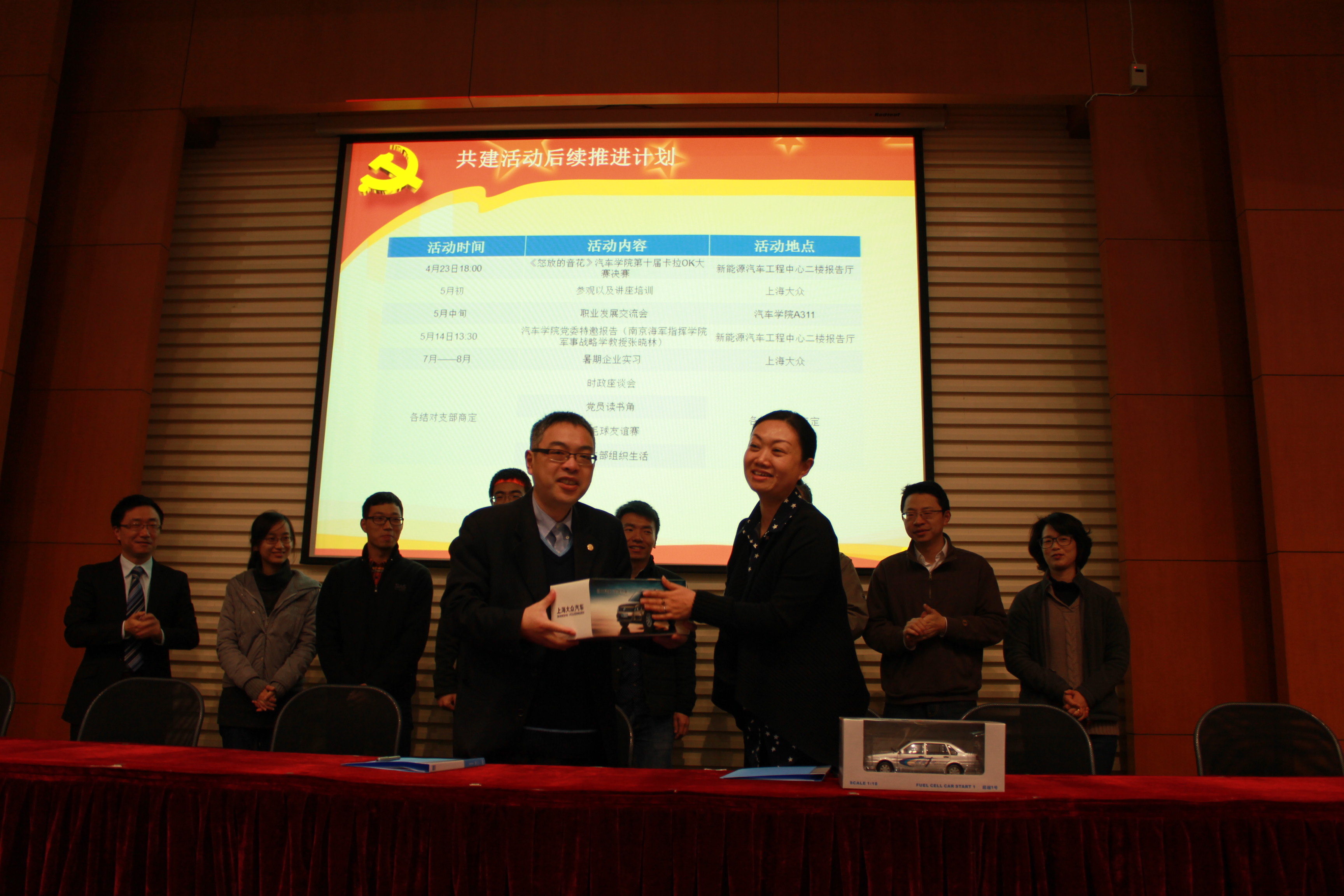 汽车学院党委与上海大众物流部党总支的党组织结对共建活动自2012年9月起开始酝酿,经过双方的反复磋商,最终确定了以建立互访机制 共同进步提高、组织生活互动 携手创先争优、深入共建交流 共育优秀人才、资助困难党员 传递组织温暖等四个方面为主的共建方案,并敲定了下一步的具体实施计划,使双方结对共建落到实处。