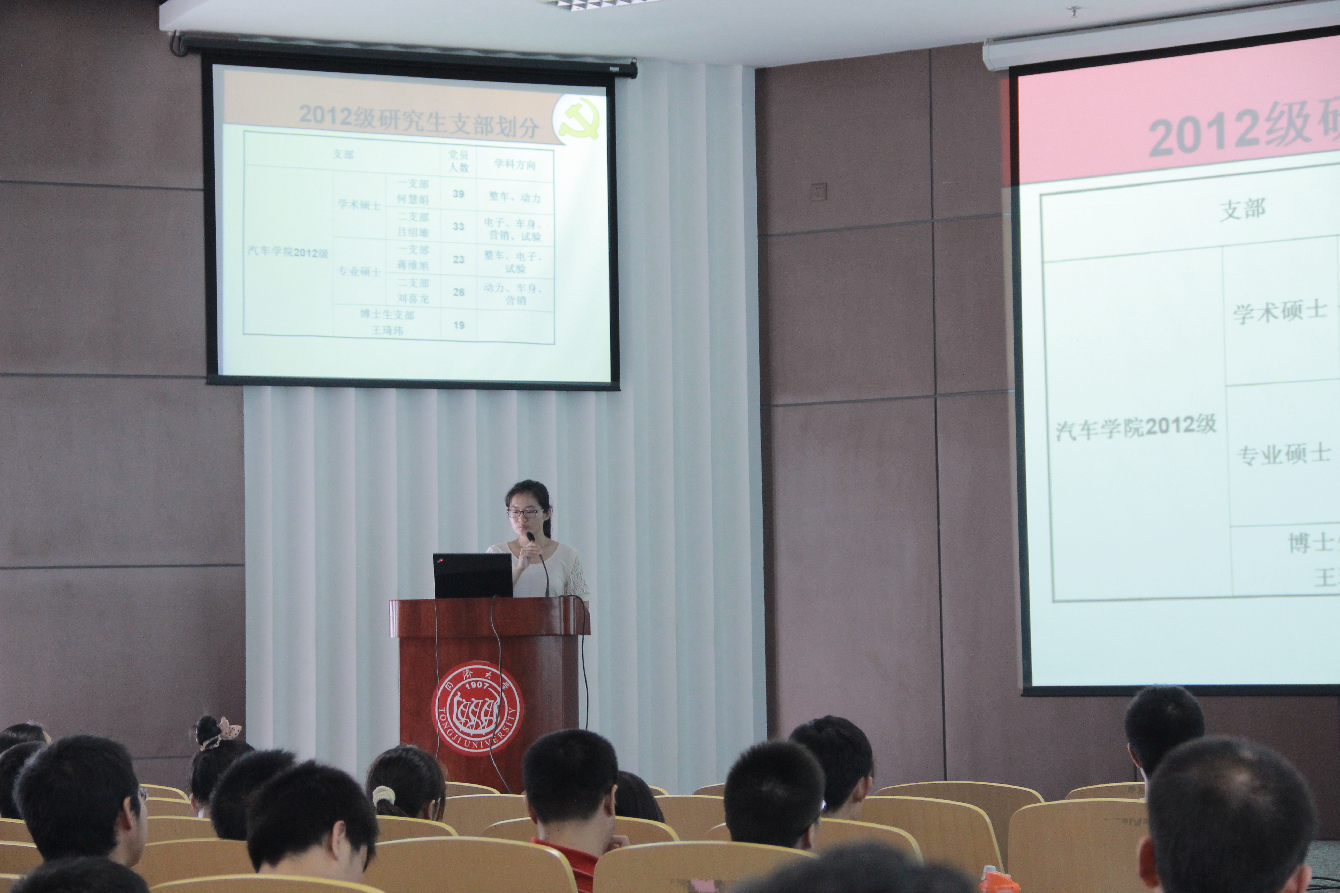 2012年10月10日中午12:30,在工程中心二楼报告厅内,汽车学院2012级研究生全体新生党员大会顺利召开。此次大会的与会人员包括汽车学院党总支副书记曹静老师、葛畅老师以及2012级全体新生党员,大会由葛畅老师主持。