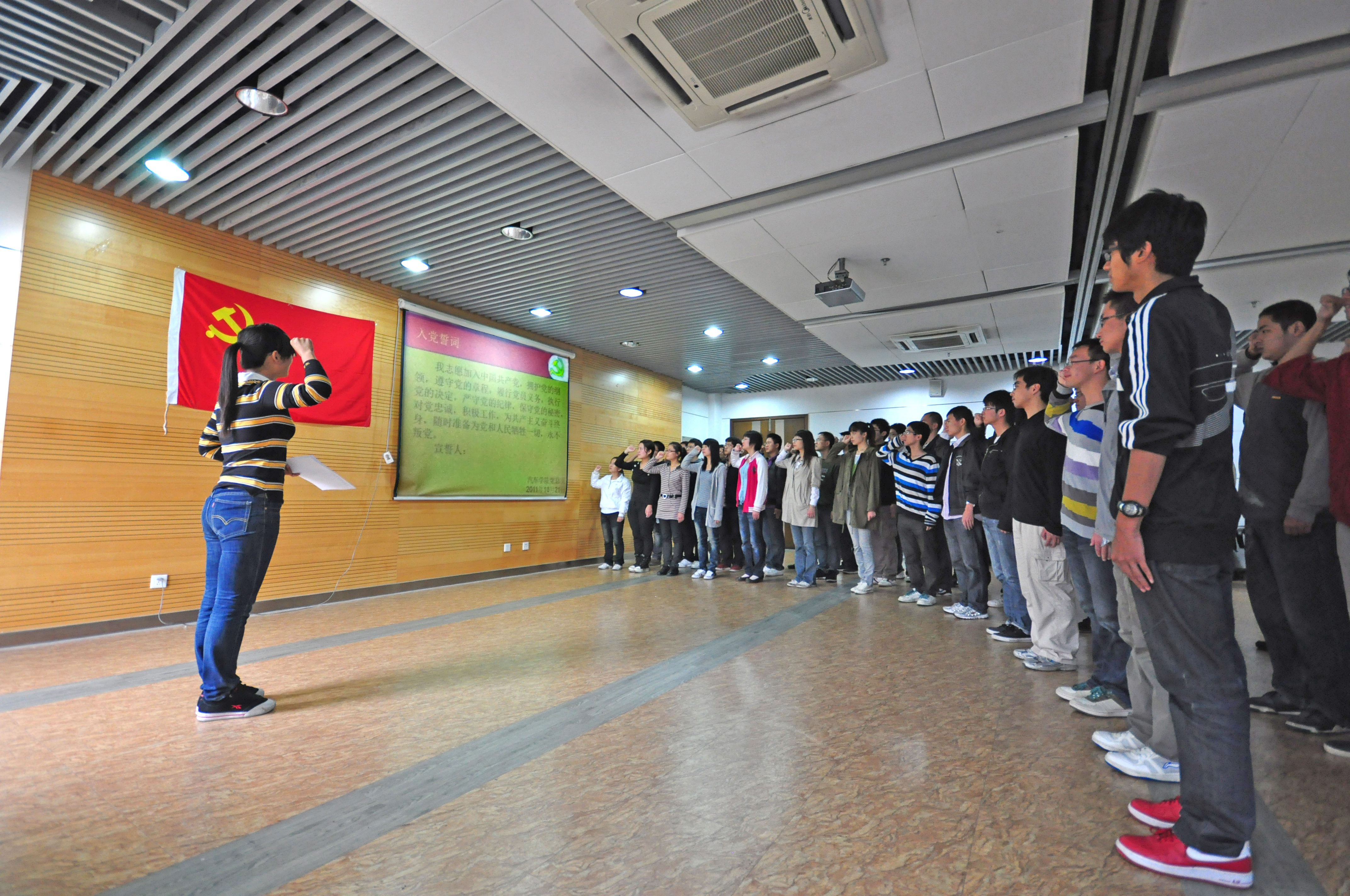 10月21日中午,汽车学院党总支组织2011年上半年发展入党的新党员,举行隆重的入党宣誓仪式。汽车学院党总支副书记曹静老师出席仪式,葛畅老师负责主持,宣誓仪式现场,44名新党员面向鲜红的党旗,举起右手,庄严宣誓,立下对党忠诚的誓言。
