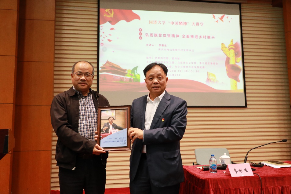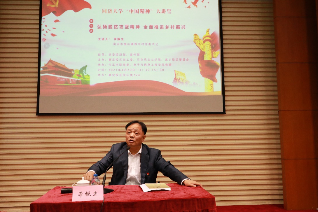 4月20日,同济大学“中国精神”大讲堂暨汽车学院第四十五期“同车行”党委特邀报告于同心楼225报告厅举行,福建省南安市梅山镇蓉中村党委书记李振生应邀为学院师生党员开展“弘扬脱贫攻坚精神,全面推进乡村振兴”主题讲座。嘉定校区党工委副书记覃文忠、汽车学院党委书记曹静和两百多名师生共同参加了此次主题报告。
