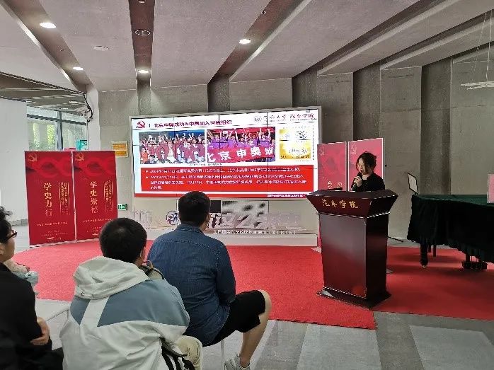 本科生第一党支部王唯同学详细介绍了中国共产党在2001年至2010年间的历程,如中国加入世贸组织、“三个代表”思想以及科学发展观的提出、北京奥运会、汶川大地震、上海世界博览会以及神舟八号发射等事件。