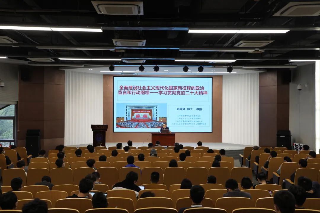 11月22日,汽车学院第四十九期“同车行”党委特邀报告于新能源汽车工程中心二楼报告厅举行。上海市党建研究会特邀研究员陈荣武教授为学院师生党员带来“全面建设社会主义现代化国家新征程的政治宣言和行动纲领——学习贯彻党的二十大精神”主题报告。汽车学院党委副书记葛畅老师主持报告,学院党委班子成员与全院师生党员代表共同参加报告会。