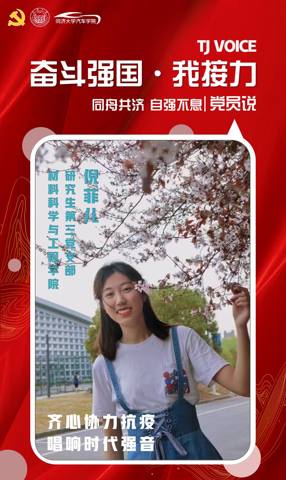 倪菲儿,同济大学材料科学与工程学院研究生第三党支部书记,2020级硕士,疫情期间担任嘉定校区友园15号楼层长。
