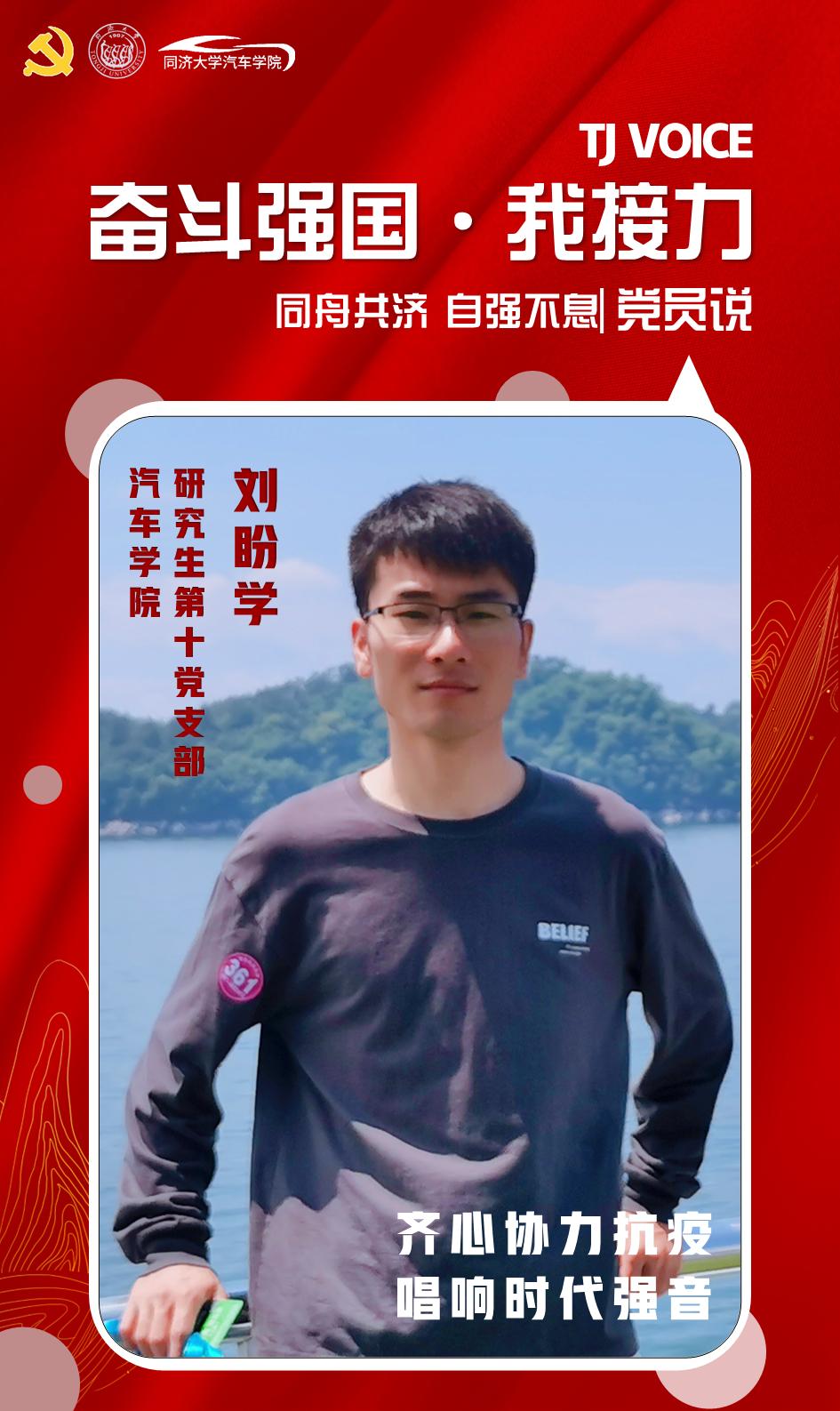刘盼学,同济大学汽车学院2017级博士研究生,现为汽车学院研究生第十党支部书记,疫情期间担任友园13号楼7层层长。