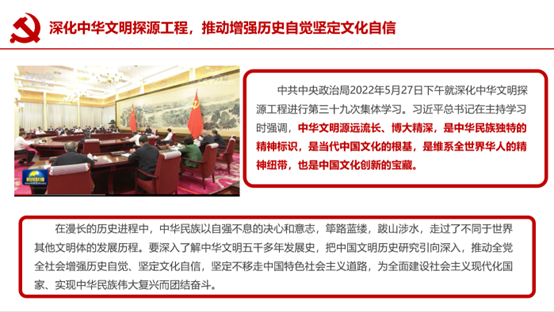 汽车学院科技创新基地党支部的唐上钦同学为大家详细介绍了中华文明探源工程。2022年5月27日下午,中共中央政治局就深化中华文明探源工程进行第三十九次集体学习。习近平总书记在主持学习时强调,中华文明源远流长、博大精深,是中华民族独特的精神标识,是当代中国文化的根基,是维系全世界华人的精神纽带,也是中国文化创新的宝藏。