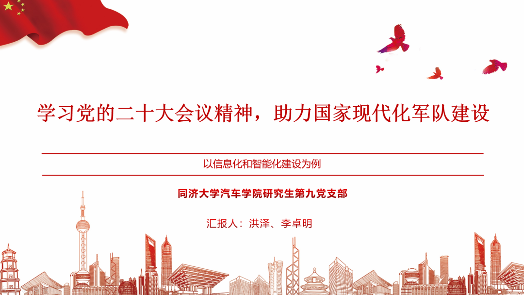 首先,由研究生第九党支部洪泽和李卓明同志带来主题为“学习党的二十大会议精神,助力国家现代化军队建设”的理论知识分享。本次分析重点学习了党的二十大报告中对国防和军队现代化建设的论述,回顾我国国防和军队建设的伟大成就。同时强调了经济发展与科技进步对国防和军队现代化建设的重大作用,鼓励广大汽车青年要积极参与到国防科技进步的事业中,为保障人民的生命财产安全贡献自己的力量。分享结束后,张智明老师补充了汽车学院在国家军事工业项目中的重要贡献。