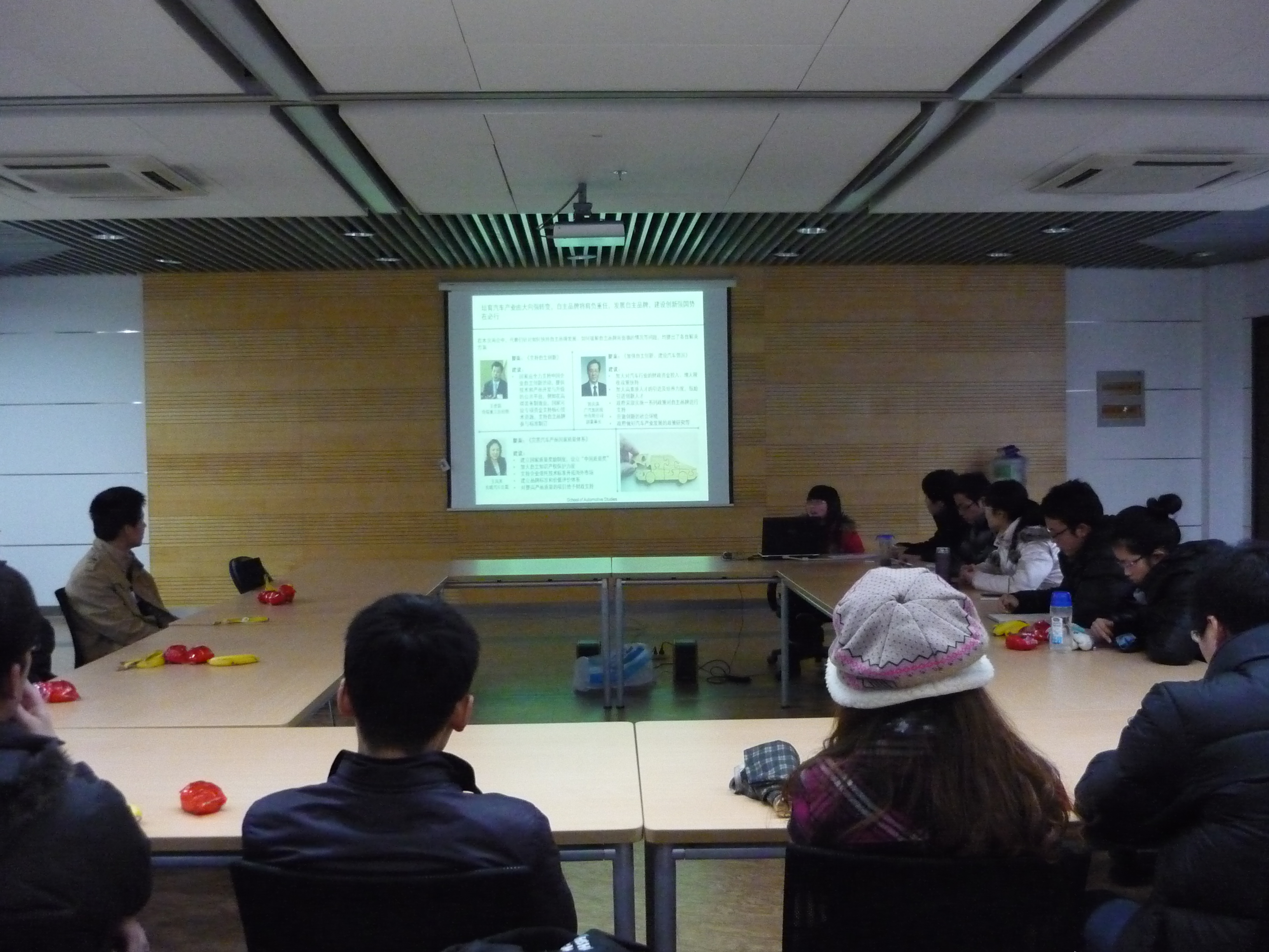 支部一直以来致力于“治思想教育创新”方面的工作,围绕此重心,开展了丰富多彩的活动。其中特色活动是“时政座谈会”。“时政”座谈会关心时政,关注国际国内形势和社会热点问题。每期针对不同主题,支部推荐材料党员分组提前对该主题进行关注、学习和分析,制作PPT展示本组分析成果,座谈会上各组进行发言讨论,并结合不同主题邀请关工委、部队、研究机构专家老师参会,进行点评,从而帮助党员同学提高政治思想水平。第一次座谈会议题为“两会相关汽车提案”,主要关注了汽车业的兼并重组,自主品牌,公车采购,以及汽车三包和车内污染等同学们切身感受到的议题。第二次座谈会议题为“汽车经销商集团繁荣背后的忧虑”,关注了近期汽车经销商集团集体上市所带来的一系列忧虑,囊括了汽车销售渠道种类、经销商集团上市的繁荣景象、繁荣景象背后的忧虑以及经销商集团的改革之路等多个方面。