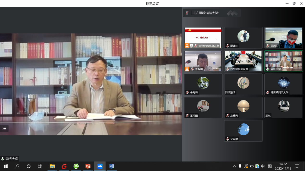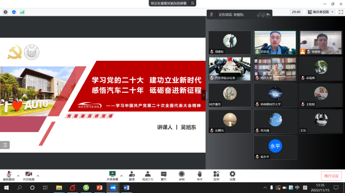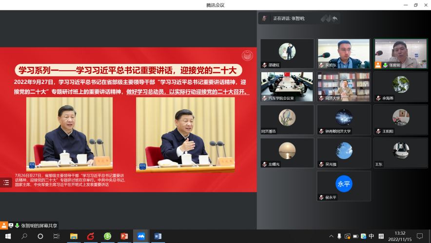 11月15日下午,汽车学院教工第一党支部召开了主题为“领会二十大精神,团结奋进新时代”的组织生活会。校党委书记方守恩,校党委办公室潘浩,汽车学院党委书记曹静,汽车学院党委副书记、院长张立军,教工第一党支部16名党员出席会议。会议采用线上、线下结合的形式,由教工第一党支部书记张智明主持。