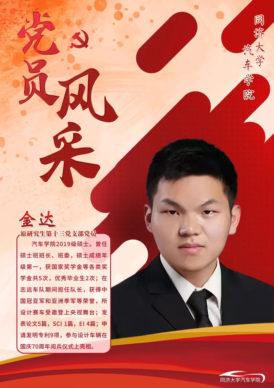 金达是一名同济汽车人,更是一名党员。他深入扎根群众,为群众办实事。担任提前毕业班班长期间,通过举办科研经验分享交流会、提供论文专利撰写指导、做好学校与同学的就业信息沟通桥梁、组织开展学术交流活动等方式积极为师生办实事。