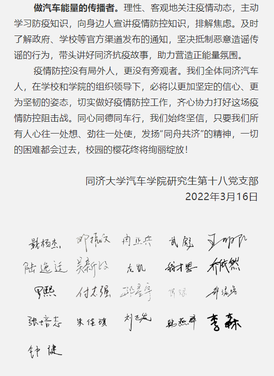 疫情就是命令,防控就是责任。汽车学院研究生第十八党支部必将在疫情防控期间进一步发挥的战斗堡垒作用,与全校师生勠力同心,用实际行动共筑抗疫防线。